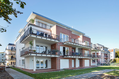 Großzügige Balkone, Loggien und Dachterrassen kennzeichnen diese Wohnungen. Akzente setzen die farblich abgesetzten Balkongeländer, die gleichzeitig etwas Sichtschutz bieten.