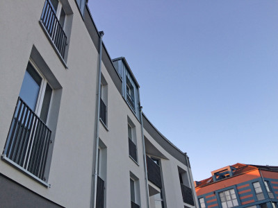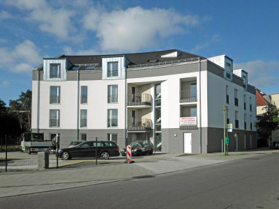 In der Marie-Juchacz-Straße 32, am südöstlichen Stadtrand der Stadt Potsdam ist ein barrierefreies Mehrfamilienhaus als 4-geschossiger Baukörper in Massivbauweise und mit Walmdachausbildung entstanden.