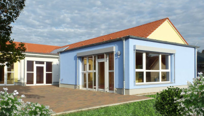 Wir haben das bestehende Gebäude durch mit einen Neubau ergänzt, welcher gemäß der Altersstruktur der Kindertagesstätte in zwei Bereiche gliedert ist.