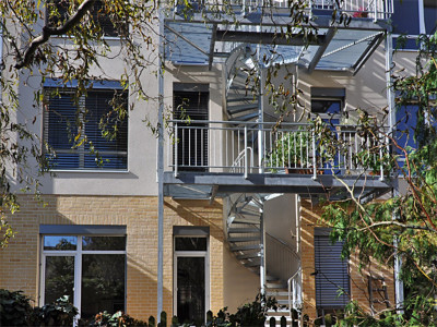 Alle Wohnungen orientieren sich zum Garten hin und erhalten dort einen Balkon. An diesen angeschlossen ist eine Stahlspindeltreppe, die als baulicher zweiter Rettungsweg fungiert und gleichzeitig ein Hingucker ist.