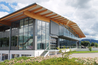Die Fassade, eine Metall-Pfosten-Riegel-Konstruktion, ist zwecks optimaler Belichtung größtenteils verglast, teilweise mit wärmegedämmten Metallpaneelen versehen. Für die gewünschte Gliederung des Gebäudes ist auf der Südseite ein äußeres Erschließungstreppenhaus in voll verglaster Ausführung angeordnet.