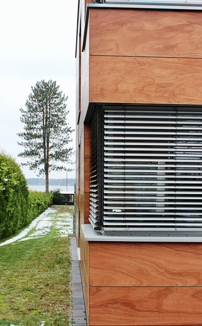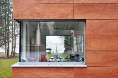 Das Haus bietet viel Platz für eine drei- bis vierköpfige Familie. Der offene Grundriss im Erdgeschoss ist derart gestaltet, dass aus allen Wohnräumen eine Sichtbeziehung zum See besteht. Über die einläufige Treppe gelangt man in das Obergeschoss mit den Schlafräumen, Kinderzimmern und Bädern. Auch von hier aus öffnet sich der Blick über die Galerie nach draußen. Die Gestaltung der Fassade mit ihrem Wechsel von großzügigen Fensterflächen und den gegliederten Fassadenplatten machen die Landschaft erlebbar.