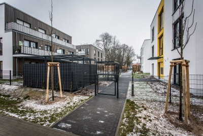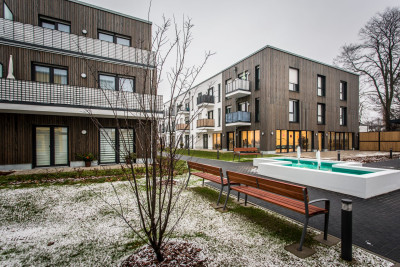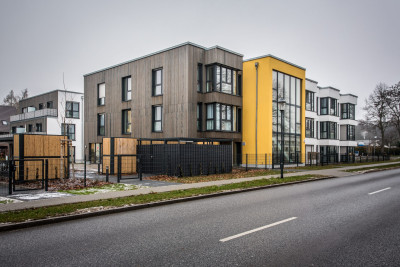 Entstanden sind vier dreigeschossige Wohngebäude mit insgesamt 50 barrierefreien Wohneinheiten zwischen 42 und 100 Quadratmetern. Was sofort ins Auge fällt, sind die besonderen Gestaltungselemente der Fassade. Die vorvergraute vertikale Holzschalung aus Weißtanne sowie die sonnengelb abgesetzten Treppenhäuser geben dem Gebäude einen ganz besonderen Anstrich. Ein kleiner Brunnen akzentuiert den Hofbereich zwischen den vier Häusern.